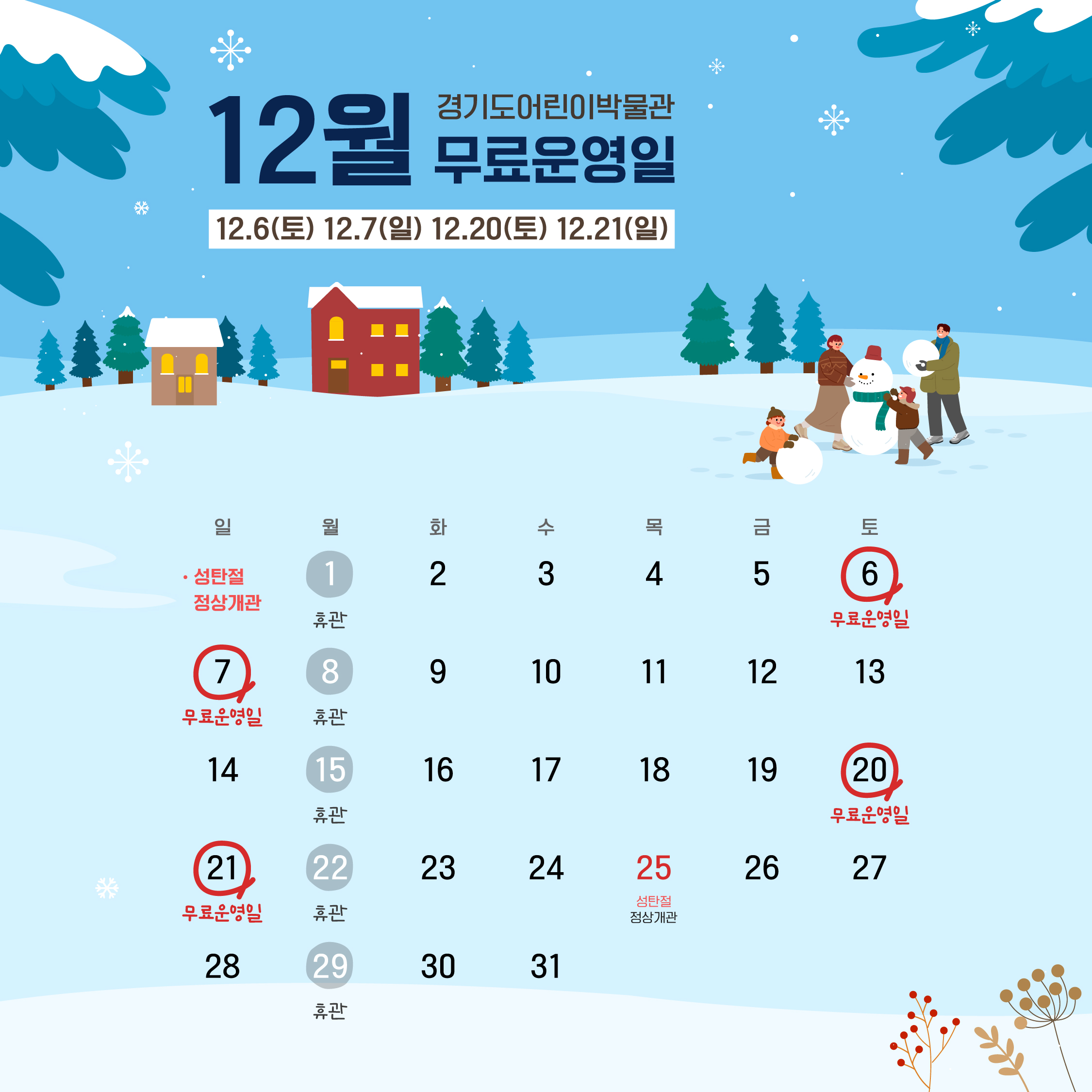 2025년 12월 무료운영일 및 휴관일 안내